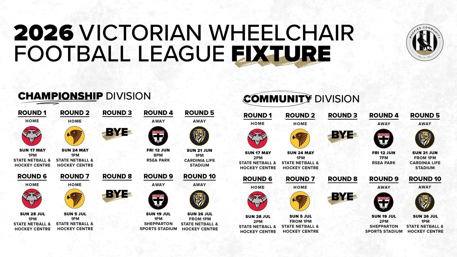 All games will be live streamed via the Victorian Wheelchair Football League Facebook page.